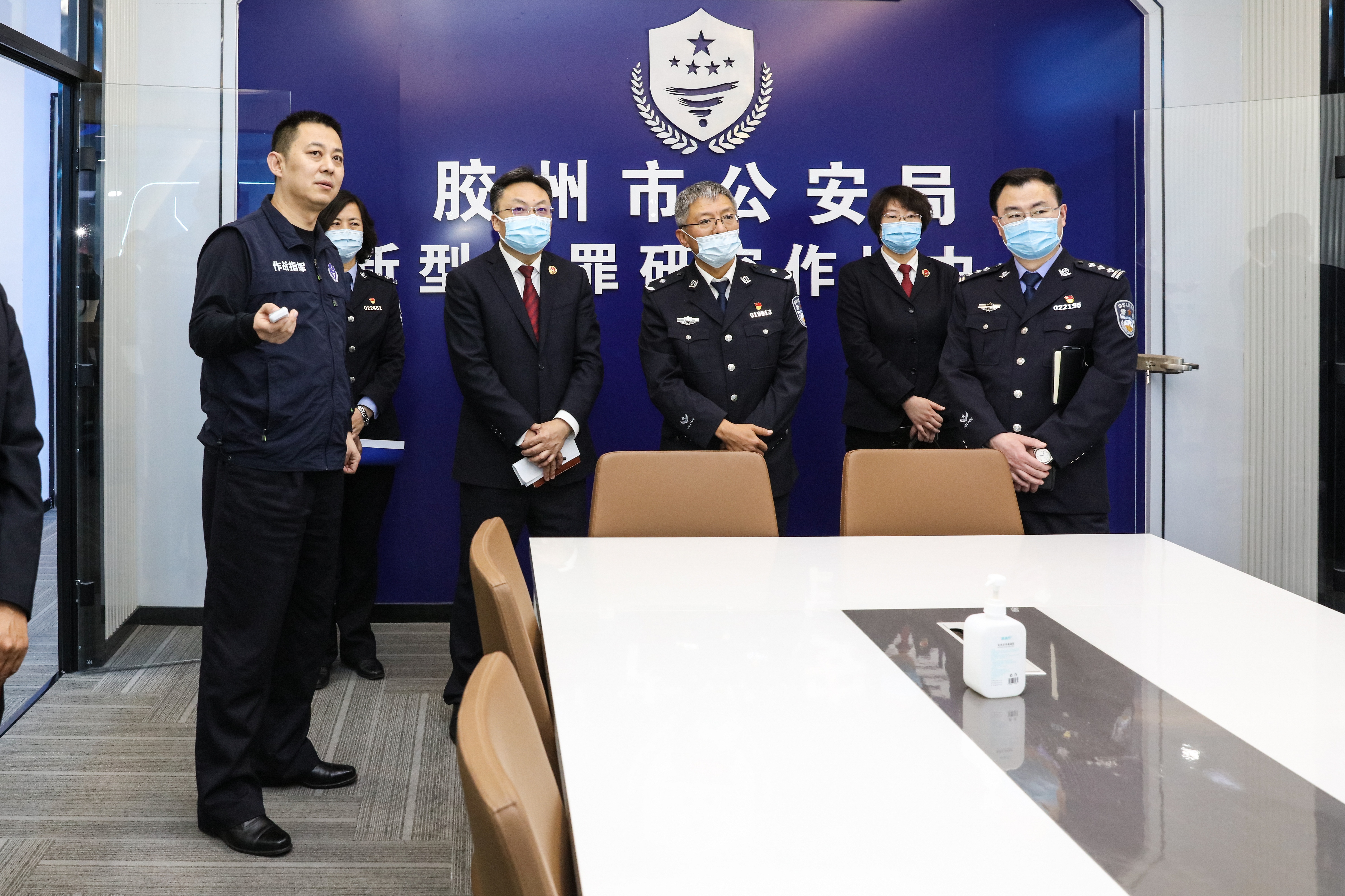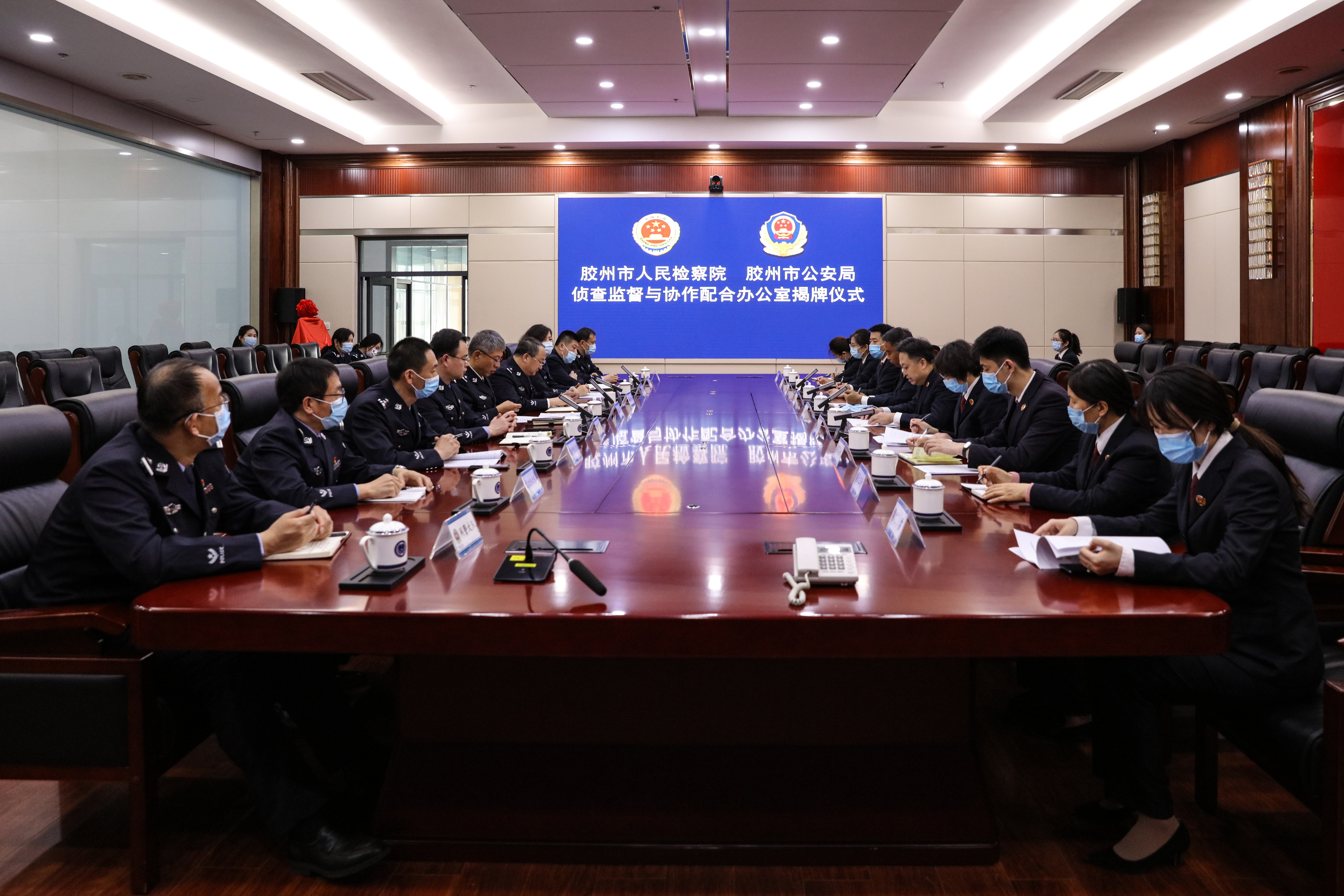 揭牌仪式后,双方就建立完善侦查监督与协作配合工作机制进行座谈,并实地考察了侦查监督与协作配合办公室、参观了胶州市公安局新型犯罪研究作战指挥中心。